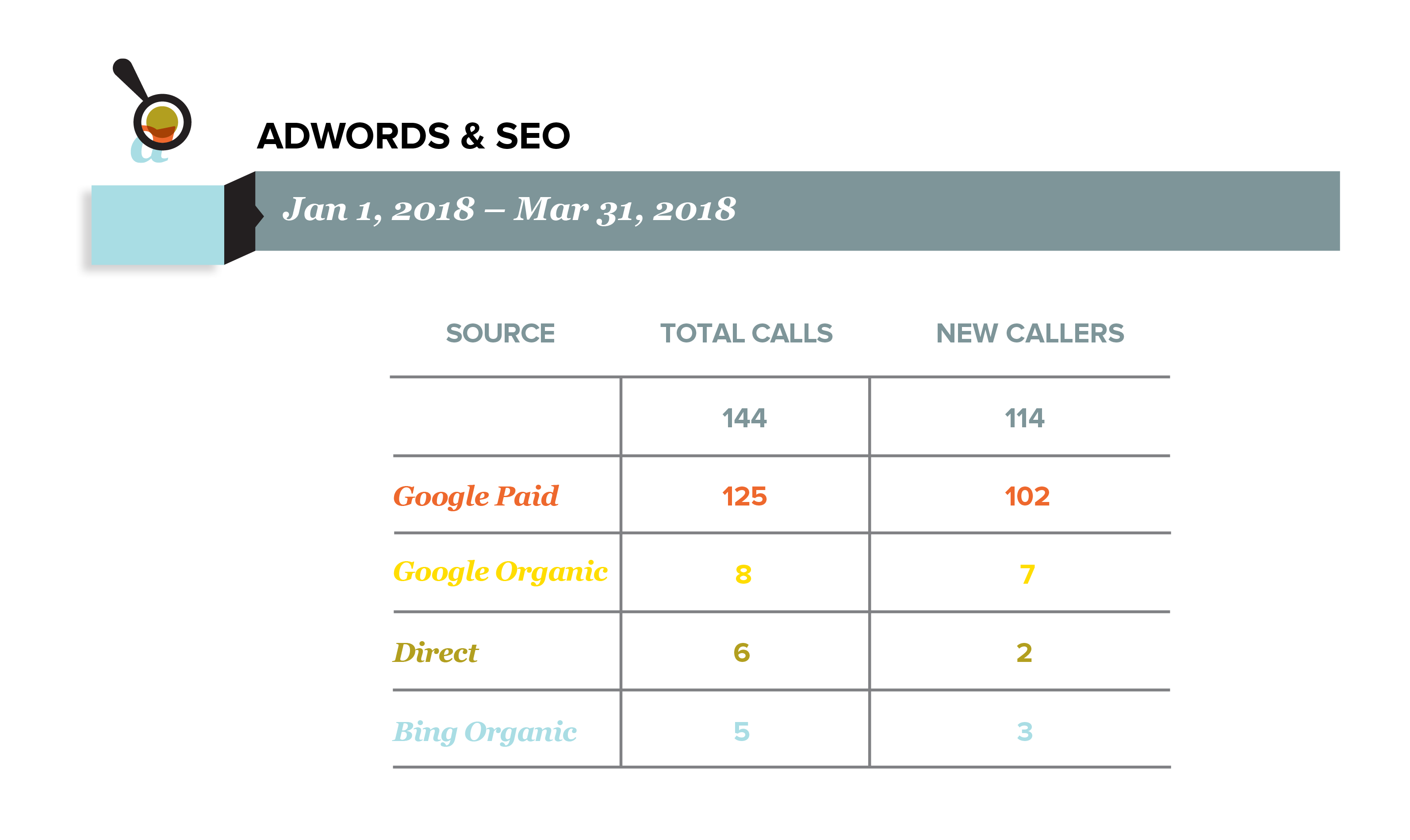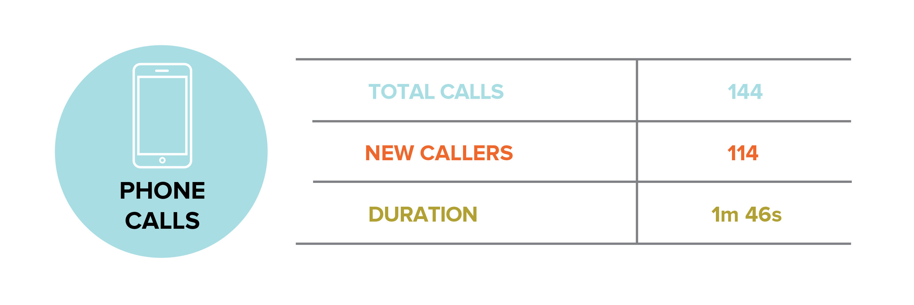 Call tracking software confirmed that 144 total calls came directly from our lead generation ads. 114 of these were “new” numbers—individuals that had not called before.