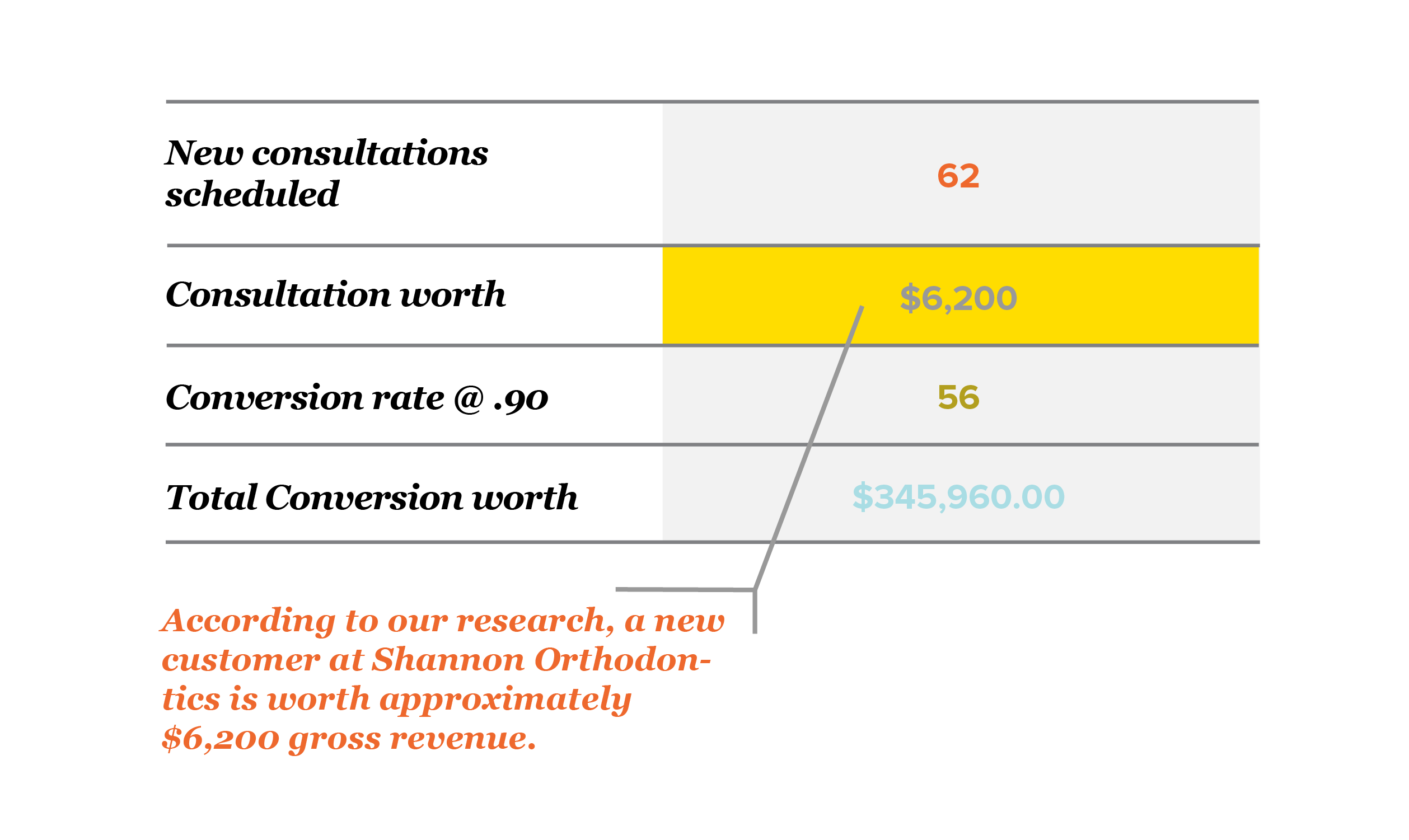 With a total of 62 appointments scheduled, adjusting for this 2nd appointment success rate, Shannon gained a net total of 56 new patients worth $345,960.00.