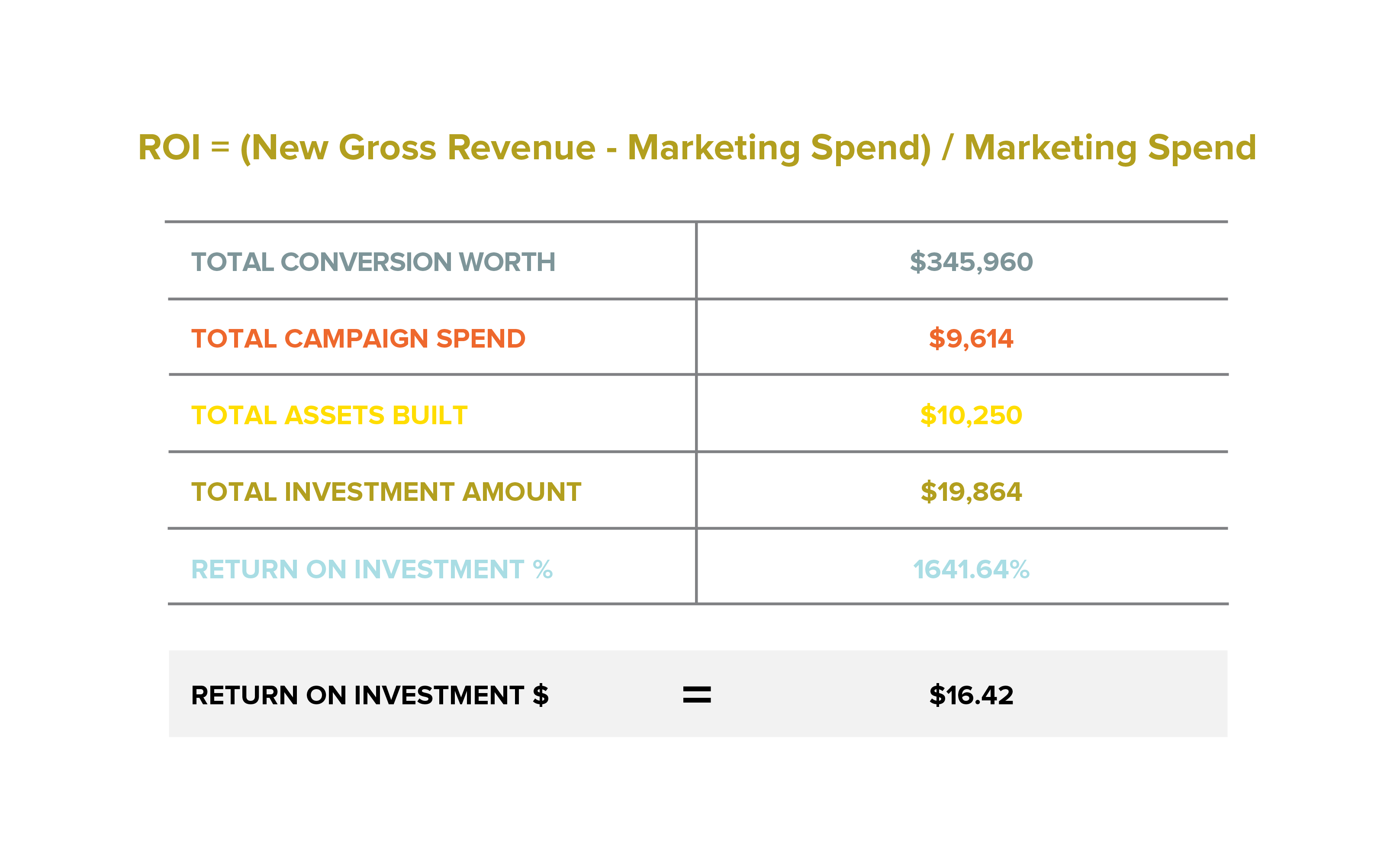 When calculating the ROI report for Shannon Orthodontics, we included the $20,000 marketing expense for all the initiatives that made this campaign successful.